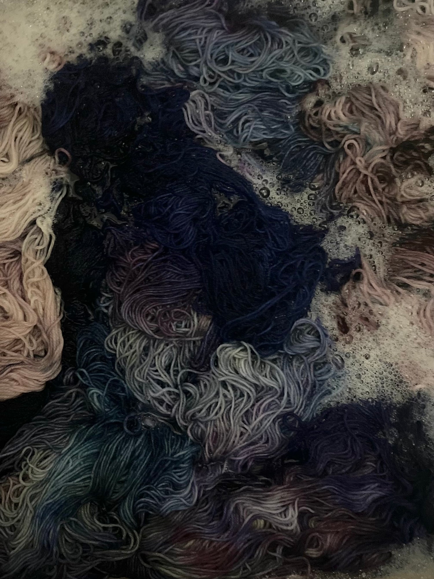 Wir färben unsere Wolle ausschließlich mit professionellen Säurefarben. Jeder einzelne Strang wird von uns anschließend gründlich gewaschen. Dafür verwenden wir neutrale Wollwaschmittel ohne Duftstoffe. Trotz des sorgfältigen Nachbereitungsprozesses können manche Farben nach dem Waschen etwas ausbluten. Das kommt häufiger bei besonders kräftigen oder dunklen Farben vor. Daher empfehlen wir die Stränge oder fertigen Projekte möglichst einzeln zu waschen und gegebenenfalls Farbfangtücher zu verwenden.