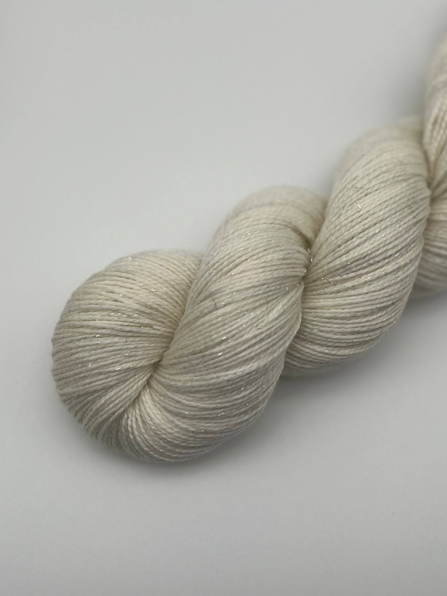 Es erinnert in seiner Rohform an glitzernden Schnee. Je nachdem welche Färbung das Garn bekommt, wird der Glitzer stärker oder dezenter.