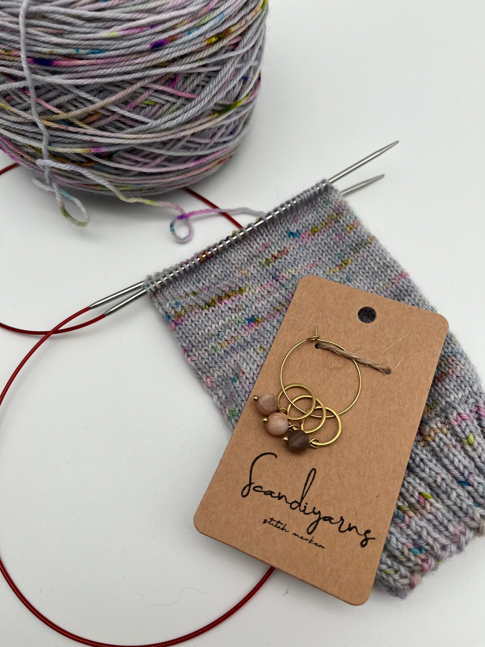 Die geschlossenen Ringe sind zum Stricken geeignet und zeigen euch Ende oder Anfang von Runden beim Stricken an. Sie können euch aufgrund der geschlossenen Form nicht von der Nadel rutschen.